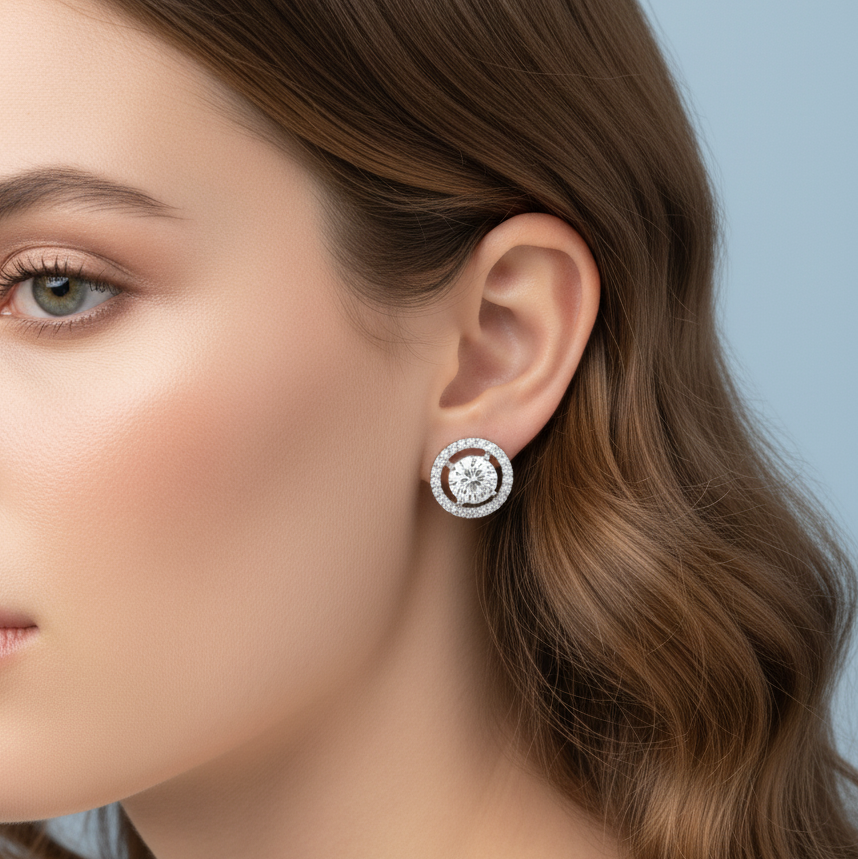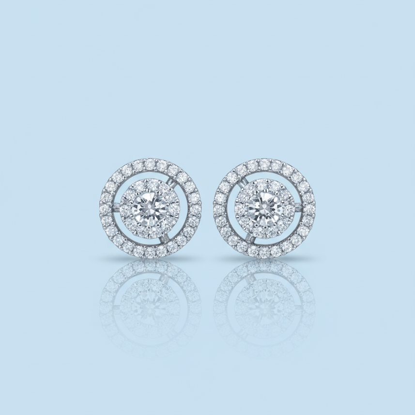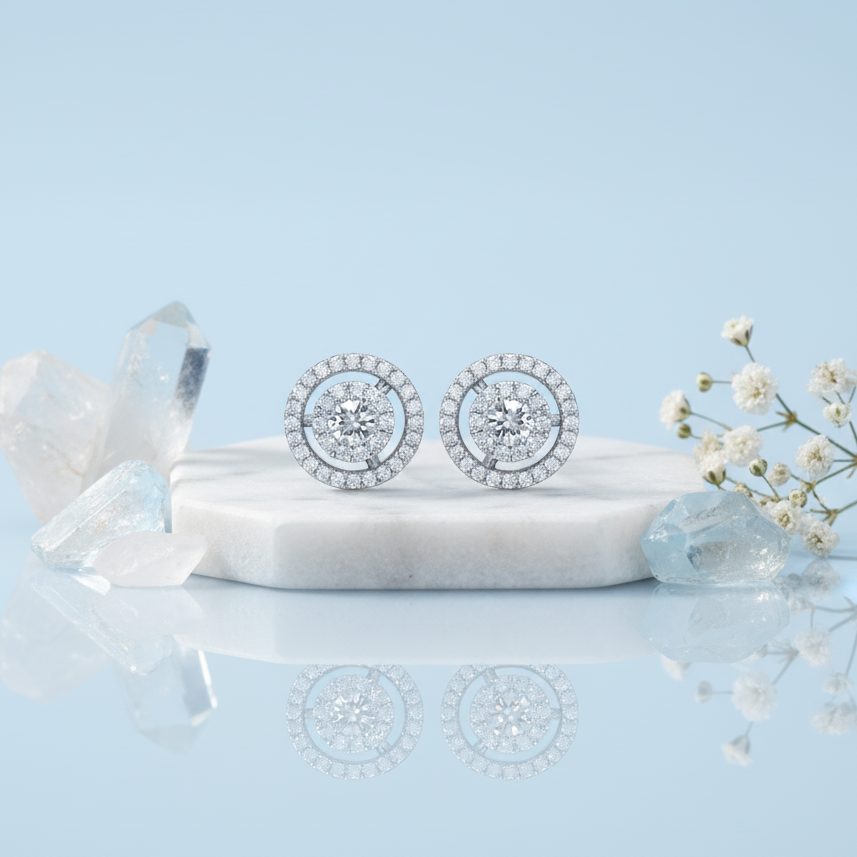 These exquisite earrings capture the allure of a starlit night, designed to add a radiant touch to any ensemble. Each stud features a dazzling central gem encircled by a halo of brilliant accents, set in a gleaming metal. Their elegant design offers a timeless sophistication, perfect for both everyday wear and special occasions. Elevate your style with these captivating pieces that promise to shimmer with every turn.